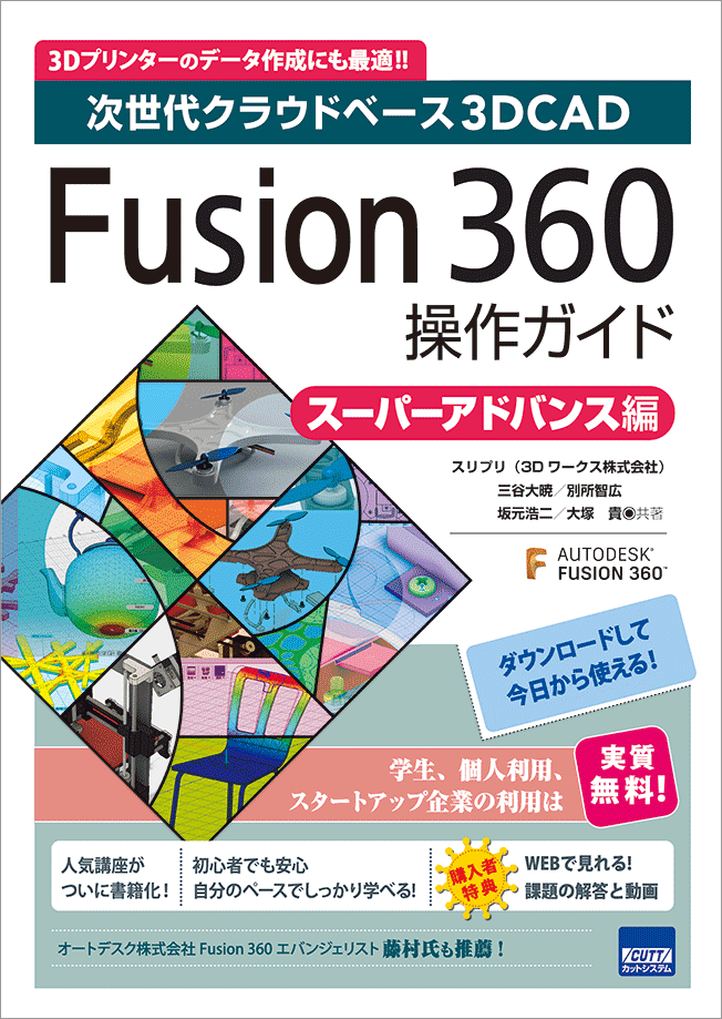 本書「Fusion 360操作ガイド[スーパーアドバンス編]」では、ベーシック編、アドバンス編で学んだ内容を応用し、複数の部品から構成される組み立て部品の設計、解析機能、スキャンデータの活用などを学習いただけます。本書は[ベーシック編]および[アドバンス編]の知識を前提として構成されておりますので、ご了承ください。